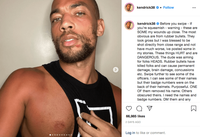 Among the protestors included HBO Insecure actor Kendrick Sampson, 32, who was hit by several rubber bullet in Los Angeles. Sampson says he was hit 7 times with rubber bullets as well as the baton. Sampson took to Twitter and said, “He pointed the gun DIRECTLY AT ME.” He was treated at the nearest ER where he also showed his injuries on his Instagram. In a recent article with Variety, he said the reason why he is protesting is to defund the police for the unfair narrative that has been told for generations.