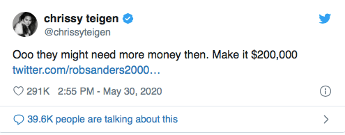 “In celebration of whatever the f— maga night is, I am committed to donating $100,000 to bail outs of protestors across the country” Teigen writes in responds to President Trump’s tweet. The amount later doubled when one user bashed her for her support of the protestors, calling them “rioters and criminals” she then responded with, ” Ooo they might need more money then. Make it $200,000.”